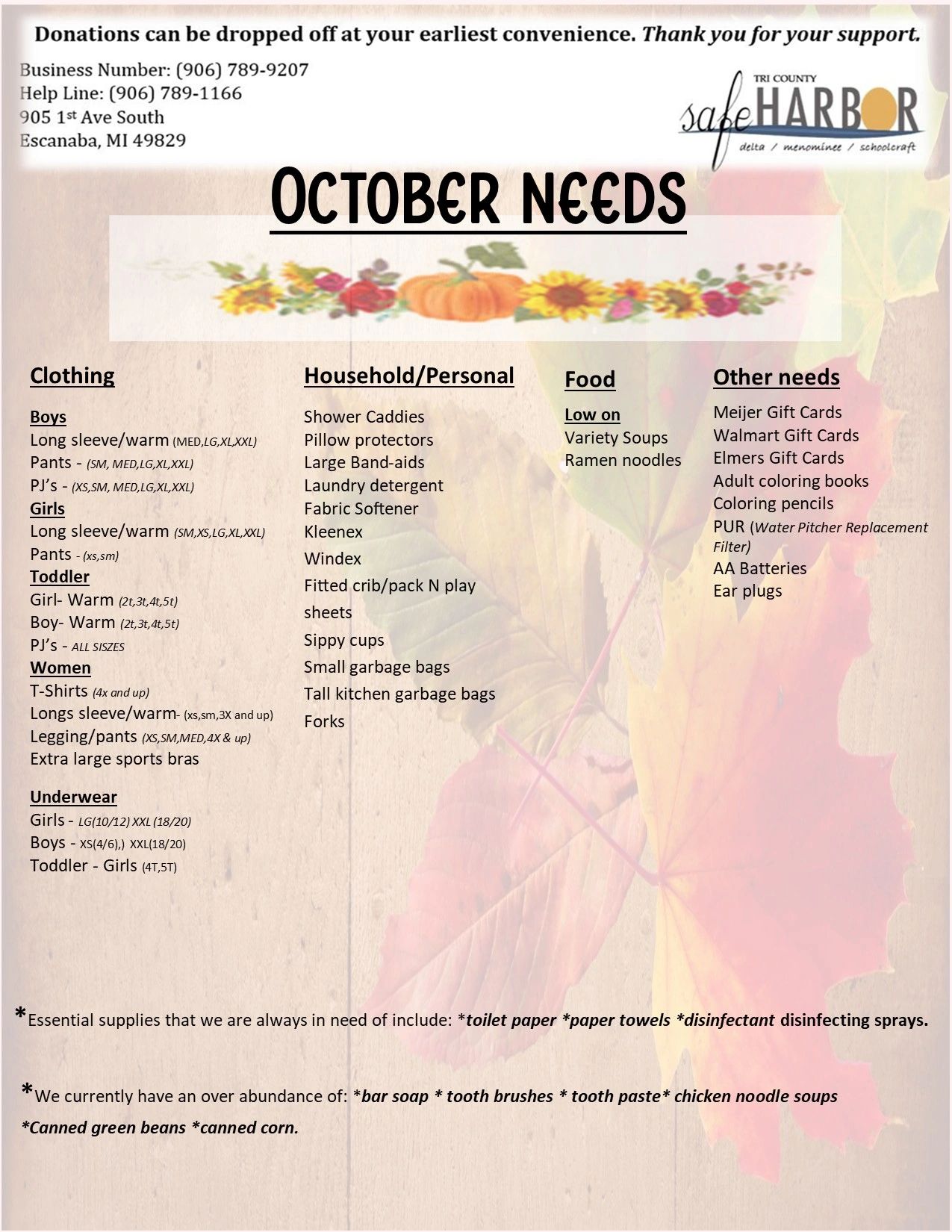 Here at Tri-County Safe Harbor we use a-lot of items and products daily to run the shelter. Our shelter also relies heavily on donations from the community to provide a clean and safe living environment to survivors.